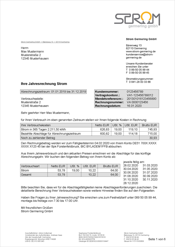 Der Fälligkeitstermin liegt 16 Tage nach der Rechnungsstellung. Je nach Zahlungsart buchen wir bei Einzugsermächtigung den offenen Betrag von Ihrem Konto ab oder Sie überweisen den Betrag fristgerecht an uns. Eine Gutschrift erscheint mit negativem Vorzeichen und wird Ihrem Konto gutgeschrieben. Bitte beachten Sie, dass bei Überschreitung des Fälligkeitstermins zusätzliche Kosten auf Sie zukommen können.