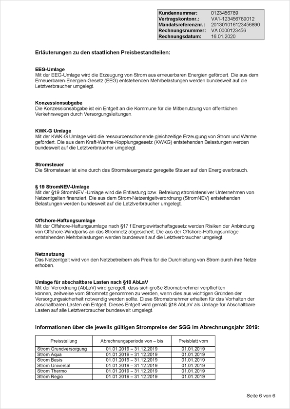 15. Bestandteile der Verbrauchskosten: Die gesetzlich vorgegebenen Informationen zur Stromlieferung und -abrechnung geben Ihnen Hinweise, Erläuterungen und Detaillierungen sowie allgemeingültige Vergleichswerte. Unter anderem finden Sie hier neben den aktuellen Kündigungsfristen auch einen Verbrauchsvergleich zwischen Ihrer Stromabnahme und den durchschnittlichen Werten verschiedener Haushalte.